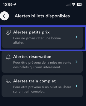 Pour vos destinations préférées, créez une alerte petits prix. Pour cela, connectez-vous à votre compte puis rendez-vous dans « Alertes billets disponibles ». Dès qu’un billet correspond à vos envies de voyage et à votre budget, on vous prévient.