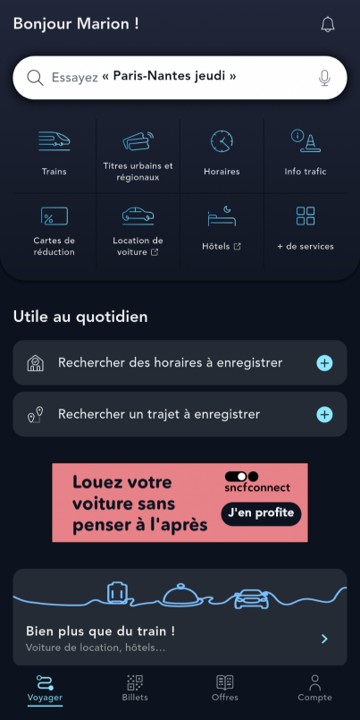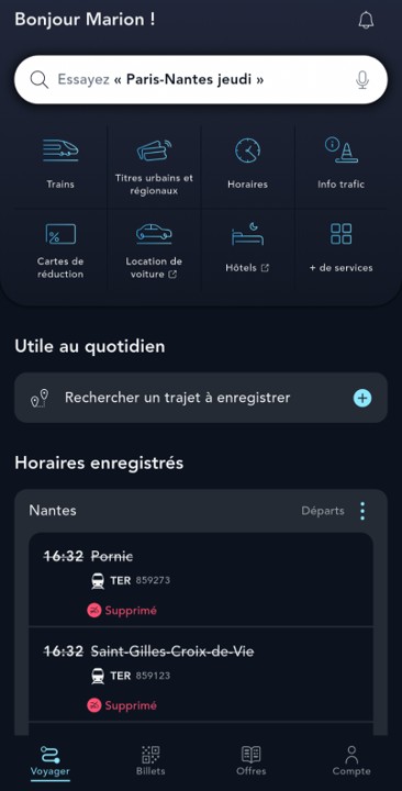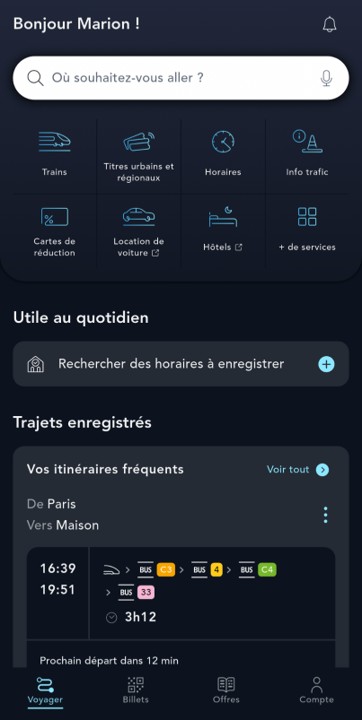 Pour une expérience plus fluide et adaptée à vos usages, la page d’accueil de l’application évolue. Désormais, un accès simplifié et direct à l’ensemble des services utiles à vos déplacements vous est proposé. Dès l’ouverture de l’application, vous pouvez ainsi retrouver des raccourcis affichés en haut de l'écran mettant en avant les services suivants :