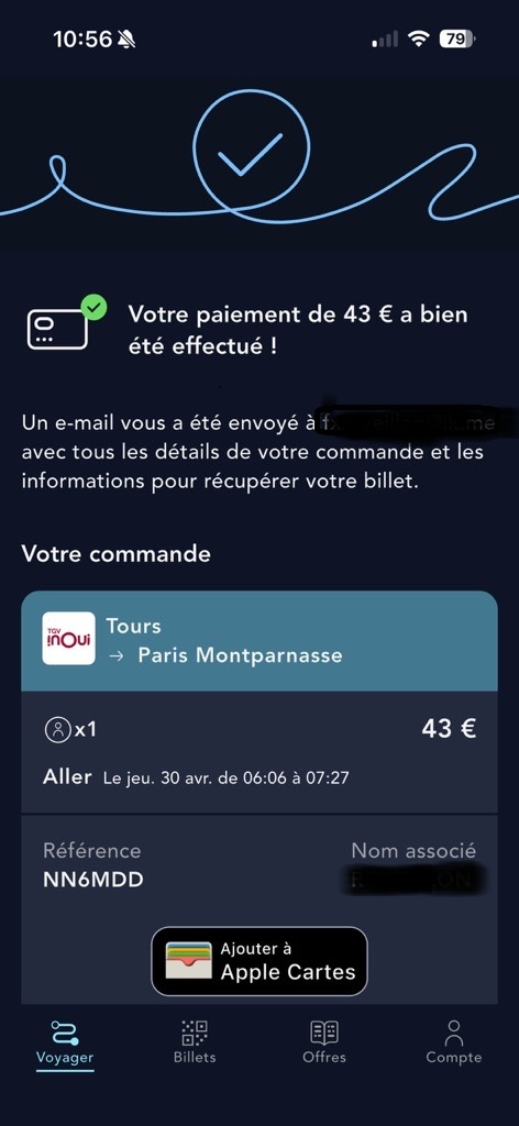 Une fois l’opération confirmée, SNCF Connect vous indique immédiatement si le paiement a été accepté ou refusé.