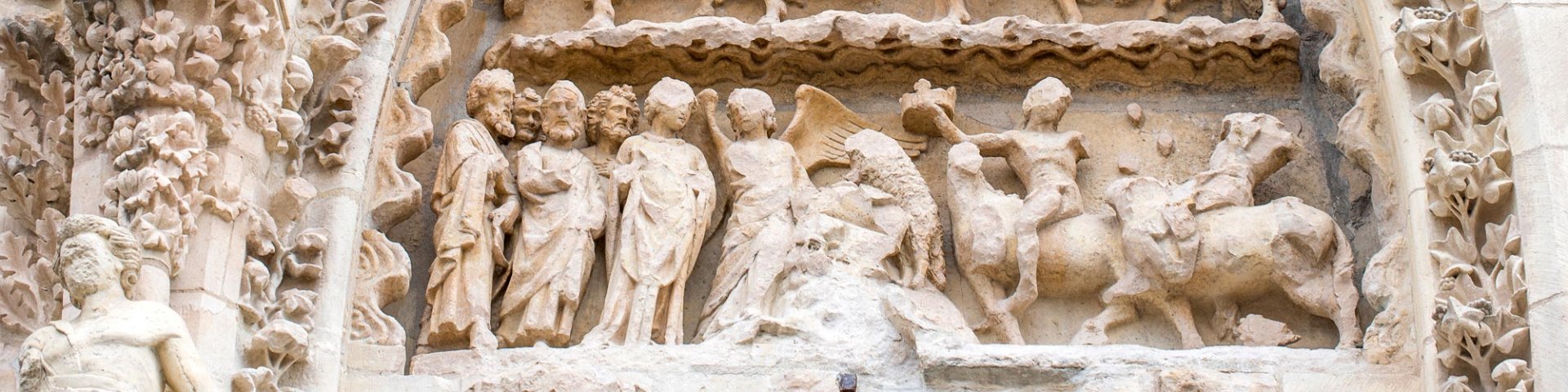 Au-dessus des trois portes, les quatre statues monumentales représentent de gauche à droite : Saint-Jean, Jésus, Marie et Saint-Pierre. Jésus est "déguisé" en pèlerin, pour montrer aux rois qui viennent se faire sacrer, que même les rois doivent rester humbles.