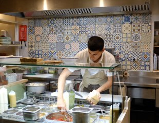 En salle, on observe dans un cadre boisé les cuisiniers s'affairer sur leur fourneaux. Tandis qu'à l'extérieur, on apprécie le calme de la terrasse donnant sur la place du marché des Chartrons.