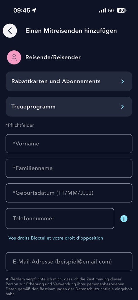 Füllen Sie die Reiseinformationen Ihrer Begleiter aus.