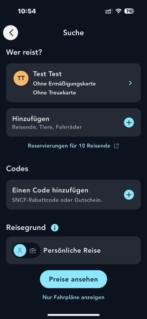 Auf der Seite der Ticketsuche: Reisezweck ändern