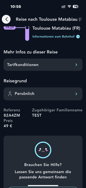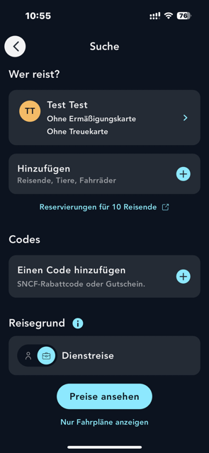 Der „Business-Bereich"" von SNCF Connect ist ein Bereich für Berufstätige, in dem Sie Ihre Geschäfts- und Privatreisen über ein einziges Kundenkonto verwalten können. Sie können Ihre Reisen leicht unterscheiden und zahlreiche Funktionen nutzen, die speziell auf die Bedürfnisse von Geschäftsreisenden und Unternehmen zugeschnitten sind.