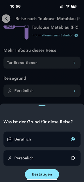 Wählen Sie den Reisezweck, indem Sie entweder „geschäftlich" oder „privat" auswählen