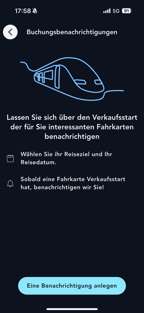 Sie planen eine Reise und Ihr Zug ist noch nicht für den Verkauf freigegeben? Melden Sie sich für die Benachrichtigung Ticketbuchung an, um informiert zu werden, sobald die Tickets, die Sie interessieren, in den Verkauf gehen!