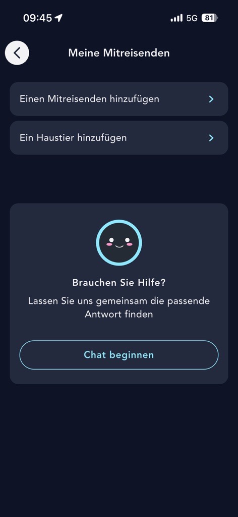Gehe auf der Website oder in der App zum Bereich Account und überprüfe, ob du eingeloggt bist. Unter "Reisepräferenzen" klicken Sie auf "Ihre Begleiter" und füllen Sie dann das Reiseprofil der Personen aus, mit denen Sie reisen, oder das Ihres Haustiers.