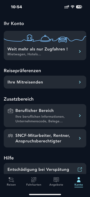 Der „Business-Bereich"" von SNCF Connect ist ein Bereich für Berufstätige, in dem Sie Ihre Geschäfts- und Privatreisen über ein einziges Kundenkonto verwalten können. Sie können Ihre Reisen leicht unterscheiden und zahlreiche Funktionen nutzen, die speziell auf die Bedürfnisse von Geschäftsreisenden und Unternehmen zugeschnitten sind.