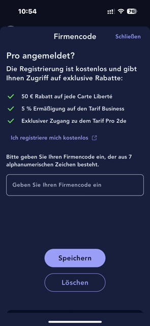 Geben Sie den Unternehmenscode an, den Sie beim Abschluss des „Contrat Pro" erhalten haben