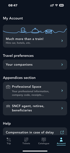 The "Business profile" of SNCF Connect is a dedicated area for professionals, allowing you to manage your business and personal travels from a single client account. You can easily differentiate your travels and benefit from numerous features specifically designed for the needs of business travelers and companies.