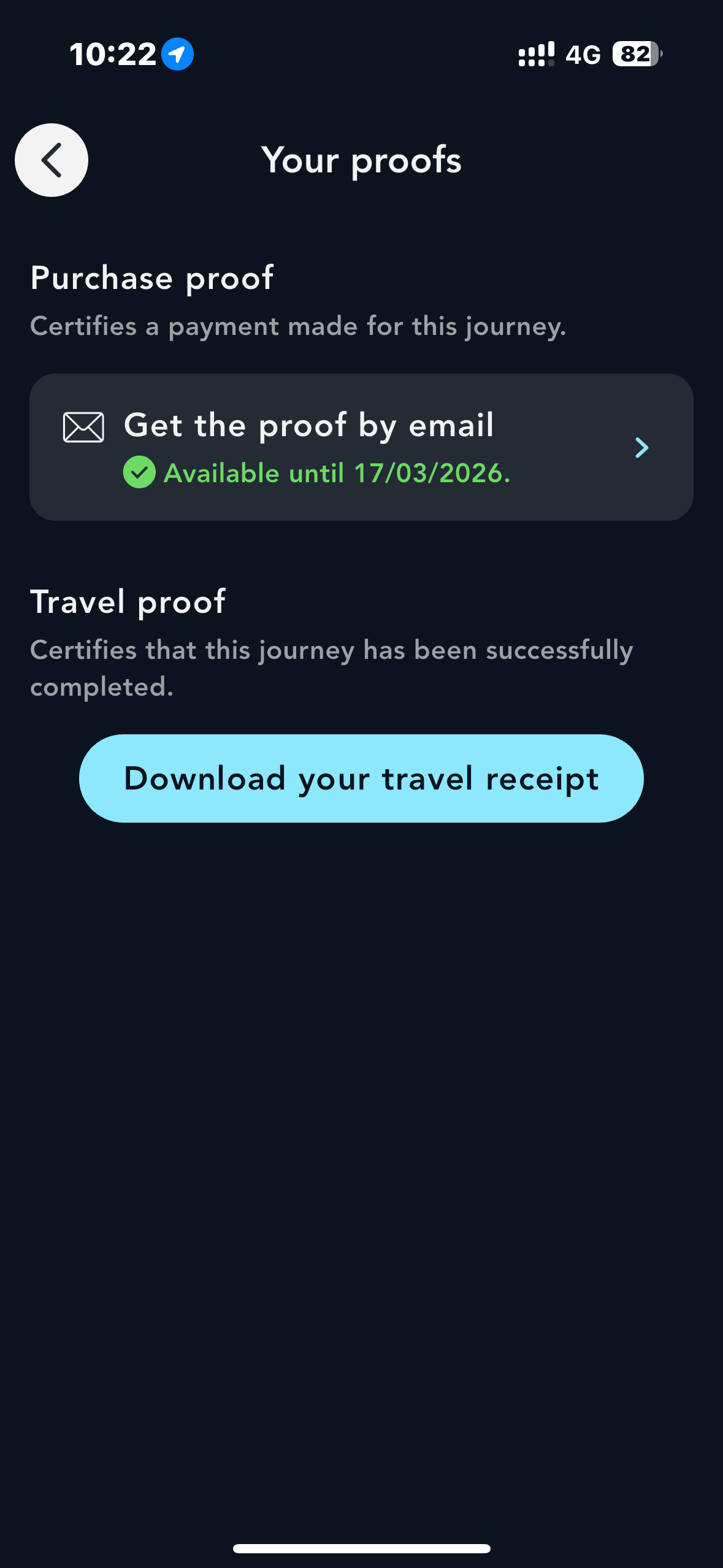 Some carriers (EUROSTAR, OUIGO, FLIXBUS, BLABLACAR BUS) do not issue travel proofs.