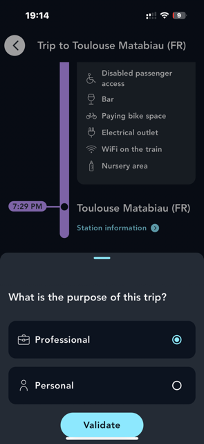 The declaration of the reason for travel can be made during the booking (on the search page) or after the booking (on the Tickets page). This allows you to classify your travels for simplified and organized management.