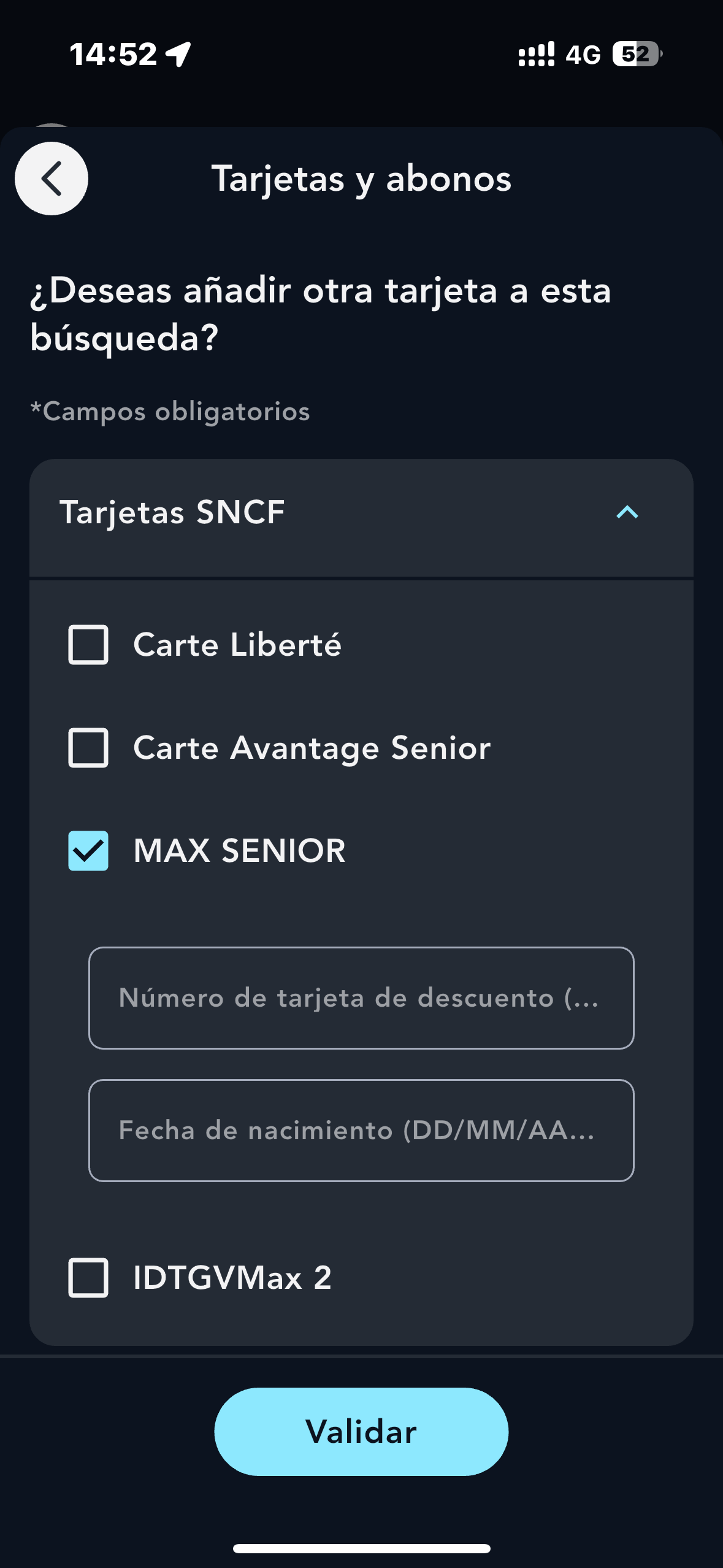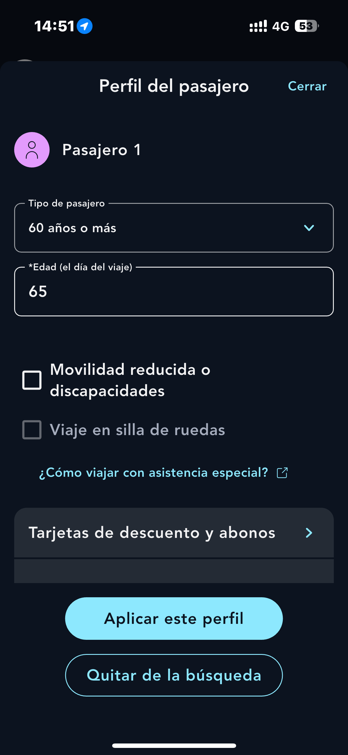 Selecciona la franja de edad (60 y más) en el menú «Pasajero 1», luego introduce tu edad y, por último, el abono MAX SENIOR correspondiente