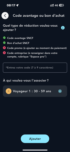 - de retour sur le formulaire de recherche, appuyez sur "Ajouter un code" et sur une fenêtre "Code avantage ou Bon d'achat". Saisissez ensuite le code de réduction et associez-le au voyageur de votre choix;