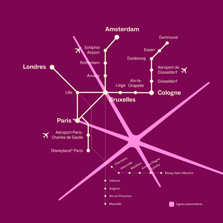 En hiver, les trains Thalys Neige vous emmènent aussi skier dans les plus belles destinations des Alpes françaises telles que Bourg-St-Maurice, Chambéry, Landry, Albertville et Moûtiers.