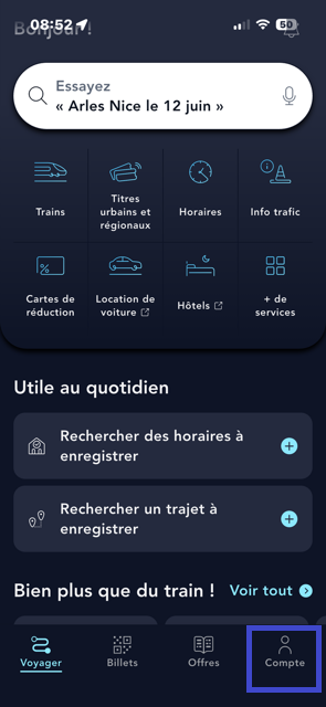 Sur l'application SNCF Connect, allez dans "Compte".