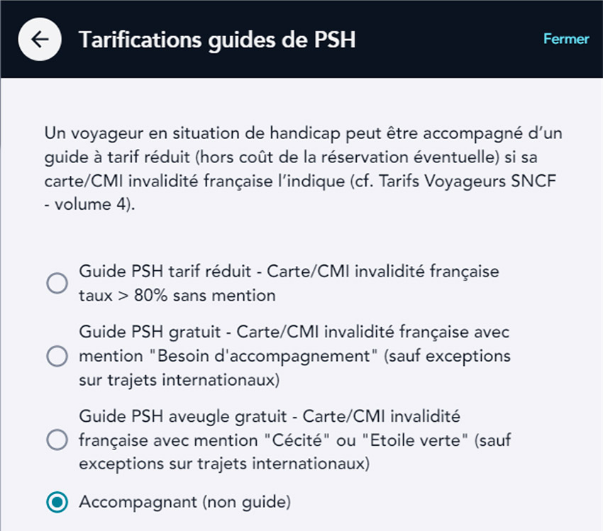 Vous pouvez demander pour un de vos accompagnateurs un tarif spécifique en fonction des mentions portées par votre carte mobilité inclusion invalidité ou carte d'invalidité. Ces réductions ne peuvent être cumulées avec d'autres réductions personnelles, et ne concernent pas les frais de réservation.