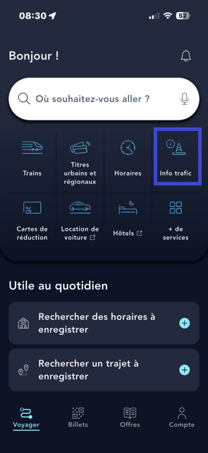 Sur l'application, appuyez sur "Infos trafic". Sur le site, cliquez sur "Voyager" et "Info trafic".