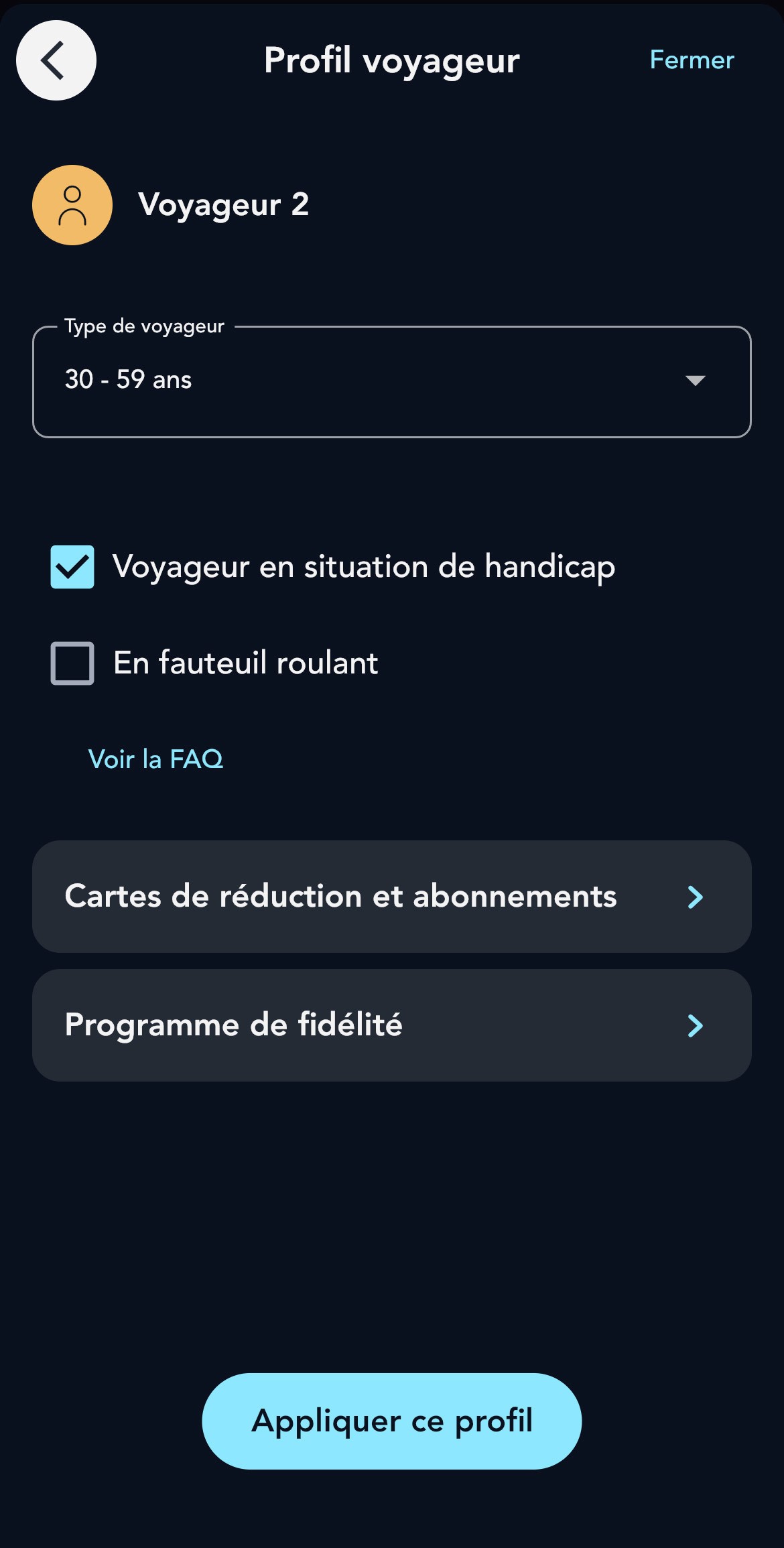 Renseignez les cartes et abonnements du voyageur si applicable.