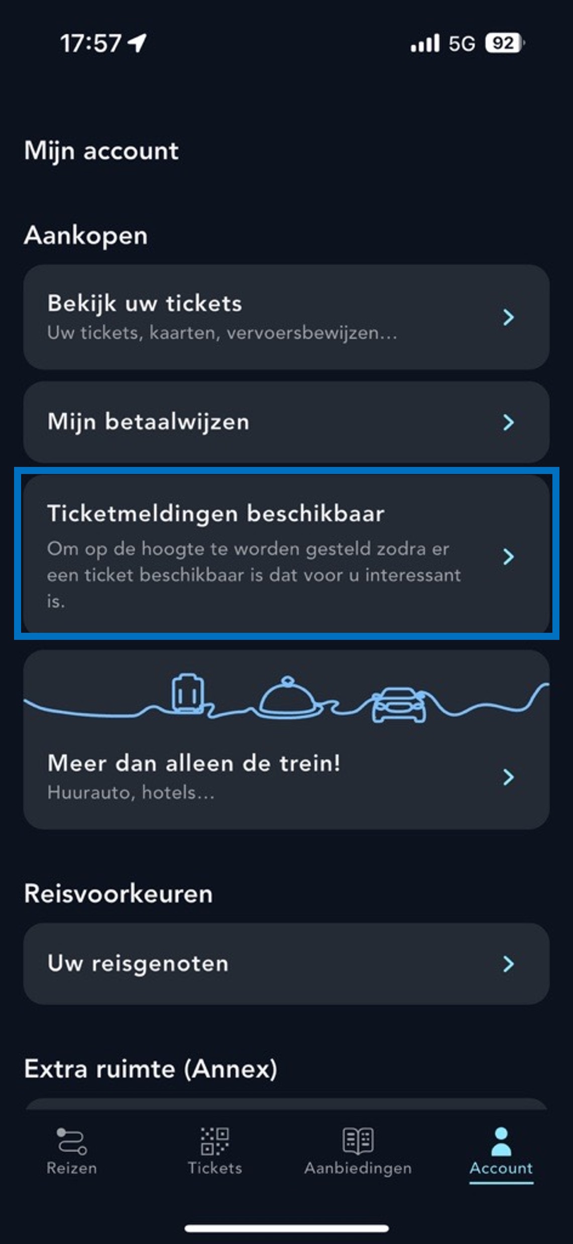 Ga naar de rubriek 'Account', klik op het tabblad 'Melding beschikbare tickets' en vervolgens op 'Boekingsmeldingen'. Voer vervolgens uw traject en de datum van uw reis in en kies de treinen die u interesseren. Als u niet bent ingelogd op uw account, voer dan het e-mailadres in waarop u wilt worden ingelicht.