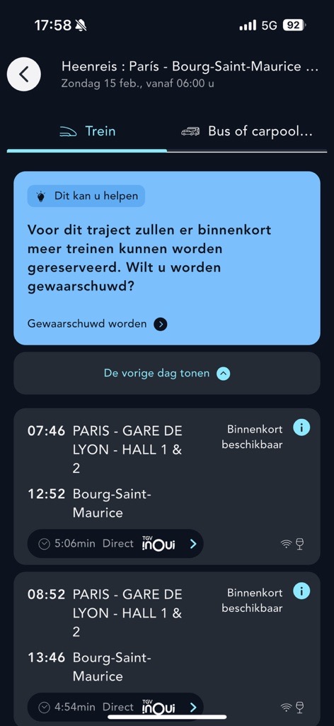 Het inschrijven op de boekingsmelding wordt u ook aangeboden wanneer u op zoek bent naar een traject waarvan de treintickets nog niet te koop zijn.