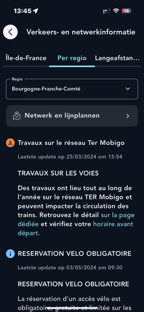 In de app kunt u zelfs de plattegronden van de vervoersnetwerken en -lijnen in Parijs en Île-de-France en die van de TER-treinen en TGV INOUI-, INTERCITES- en OUIGO-langeafstandstreinen bekijken en downloaden.