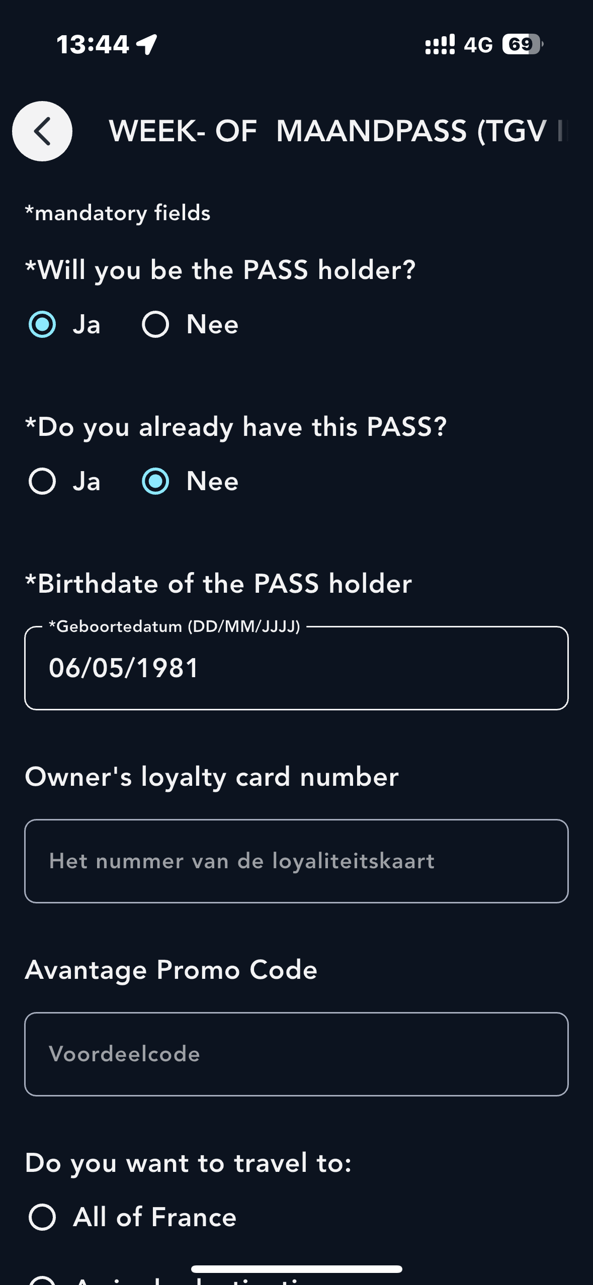 Vul het formulier in en geef aan voor welk traject u de pas wilt kopen.