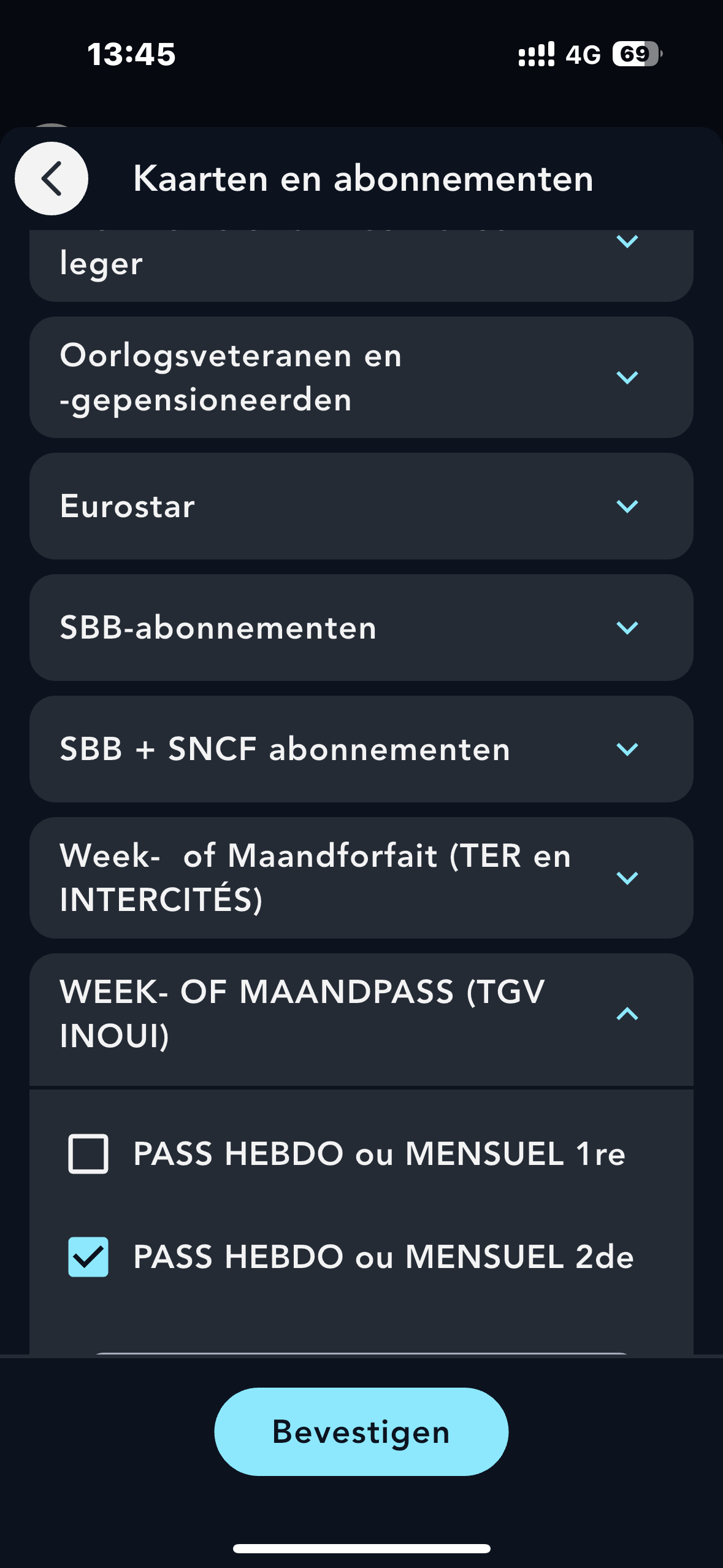 Klik op "Kortingskaarten en abonnementen" en selecteer vervolgens uw PASS HEBDO of PASS MENSUEL in 1e of 2e klas.