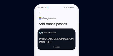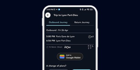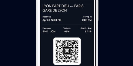Vanaf de website of in de de SNCF Connect-app (op telefoons met een Android besturingssysteem) kun je je e-ticket opslaan in je Google Wallet, zodat je hem tijdens je reis gemakkelijk kunt terugvinden. Met één klik heb je toegang tot je treinticket en alle nuttige informatie die nodig is voor en tijdens je reis: reisdatum en -tijd, QR-code, treinnummer, stoelnummer, etc. Je kunt ook je reisgeschiedenis bekijken. Snel, handig en veilig!
