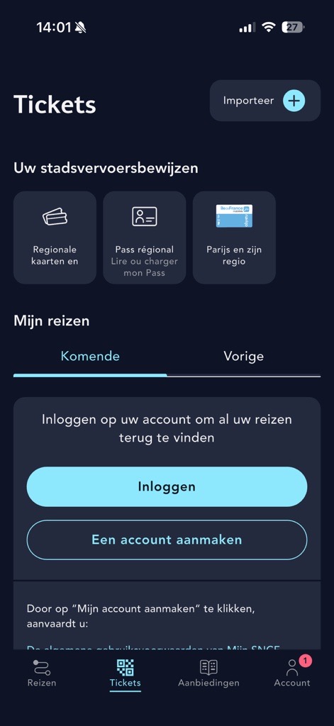 Log in op je account om je reizen te vinden of klik op "Eeb vervoersbewijs importeren".