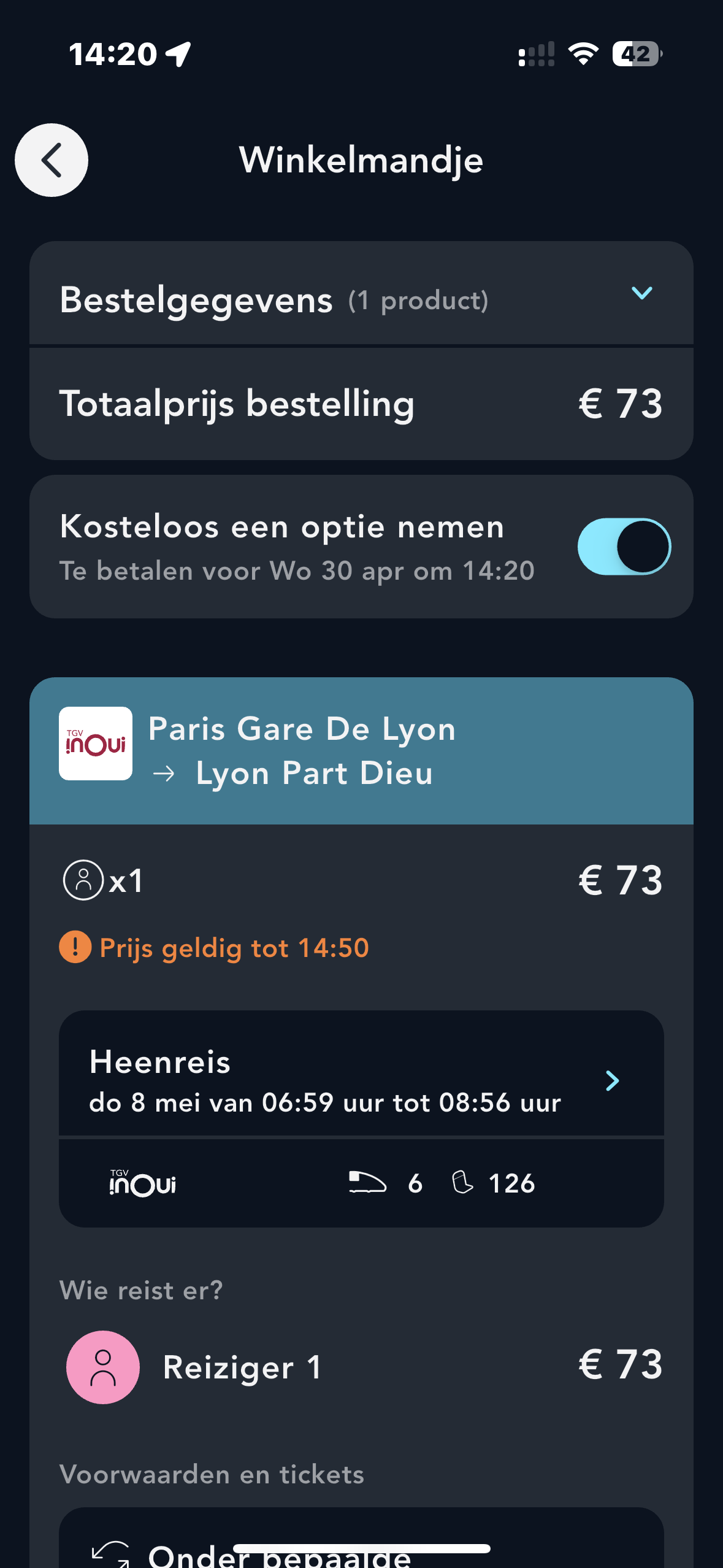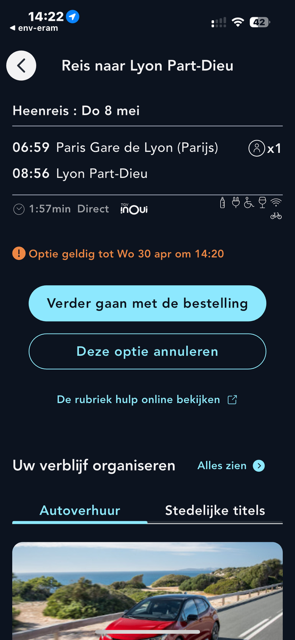 U kunt voor veel treinen een optie nemen voor een omwisselbaar en terugbetaalbaar tarief: TGV INOUI, INTERCITÉS, TGV Lyria, en tot 48 uur vóór vertrek van de trein.De optie wordt niet aangeboden op de niet-omwisselbare en niet-terugbetaalbare tarieven, op OUIGO, Eurostar en TER.